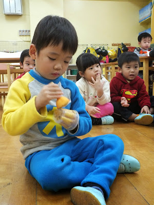 之後我們進行新年話吉祥活動,每樣食物或水果都有吉祥話意義的喔,中大班小朋友對花生蘿蔔的台語吉祥話很感興趣,所以請孩子們將每樣物品名稱命名並找出吉祥話相關國字,活動結束後觀察寶貝們還一直不停地覆誦食物的吉祥話呢?中班小朋友都很期待過年的到來,於是老師和孩子們團討決定要製作春聯與鞭炮,寶貝們手拿毛筆寫春字,還不太能控制寫的字又粗又大,但孩子親自寫的春聯都感到特別興奮,於是將寶貝的作品佈置教室,讓中大班教室內有過年的氣氛喔。