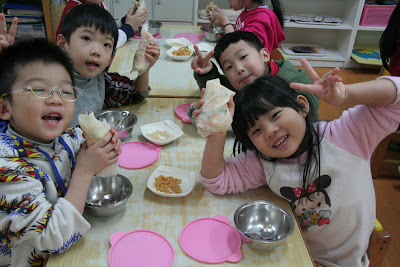 在尾牙這一天學校準備了潤餅皮、花生粉、豆芽、豆干、高麗菜、可樂果,這一天每一位小朋友都很忙碌。幼幼班的幫忙壓碎可樂果,小班幫忙挑綠豆芽,中班幫忙洗高麗菜,大班幫忙切豆干,當完成所有備料並煮熟後讓孩子自己動手包潤餅,孩子們都包了很多料,原本很擔心孩子吃不完沒想到每個孩子都吃完,每個人吃得津津有味呢。