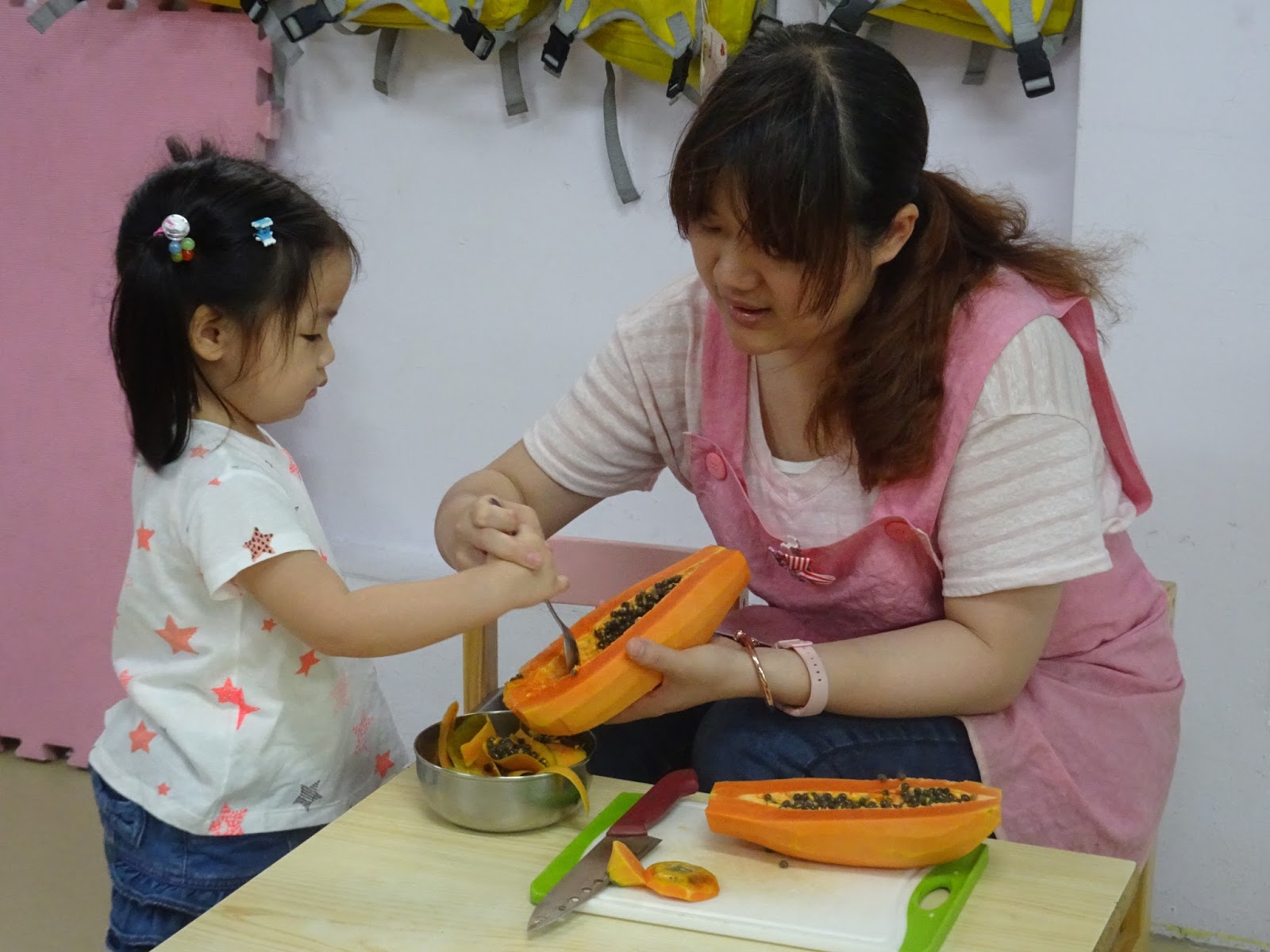 課程中我們也與孩子討論到媽媽會做的那些事﹖孩子分享到媽媽會買菜、煮飯、洗碗、修電燈、說故事、陪孩子睡覺等事,發現媽媽是萬能媽媽很多事都能做得很好。為了讓孩子能參與家事我們安排一段戲劇演出,從戲劇裡看到不作家事的孩子把家裡弄得亂七八糟的,等著媽媽善後。活動中孩子也了解到自己長大了、能力也足夠了所以能幫媽媽做的家事有那些。活動目的也是希望孩子能分擔家事減輕媽媽的辛勞!
