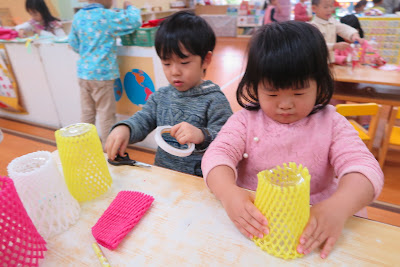 今年正好是雞年,在一次中班製作雞造型編織工時,孩子忽然提出疑問:雞有幾隻腳指頭?這個問題一提出,連老師也好奇正確答案究竟是什麼?因此老師將題目提出,請孩子與家長一同解答,為了尋找答案,簡老師除了上網查資料外,還特別一大早跑到市場詢問雞店老闆,最後不但獲得最清楚的解答,還有實際的雞腳可觀察,雞店老闆還提供雞頭讓孩子更進一步認識雞冠、肉垂、喙等部位名稱,但真正的雞頭實在太過於寫實,連老師自己看起來也有些恐懼,更何況孩子,可是實際的物品的觀察體驗又比起照片佳,因此只好將真實的雞頭布偶化,加上了粉色的不織布,看起來不那麼寫實,但部位又能真實呈現。孩子在認識時也放心大膽的觸摸、觀察,可見雞頭布偶製作成功~