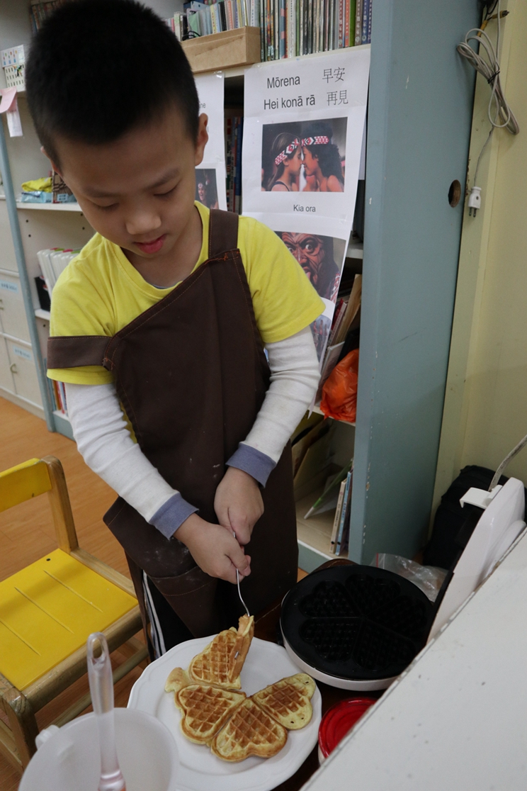 紐西蘭的美食饗宴則在全園小朋友一起努力下完成;小小班在老師協同下幫忙切奇異果、小班進行好吃的銀魚煎餅、中大班一起負責製作全園下午點心:紐澳軍團餅乾、阿姨則幫忙燉煮滾鍋燉肉湯及炸魚薯條和炸魷魚。當豐盛的紐西蘭美食滿滿的放在餐桌上,不論大小孩或小小孩都忍不住大快朵頤並不時讚美著:紐西蘭美食最好吃!