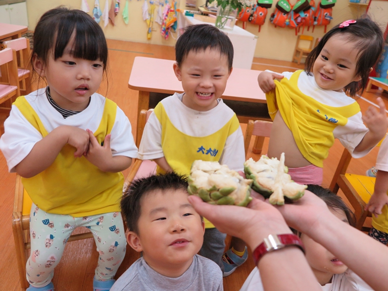 九月份與孩子一同種植的花生在這個月準備收成了,孩子在充滿期待中將花生一棵棵拔起,當發現泥土中有花生時,每個孩子超級興奮,雖然全部的花生收成後只獲得六個花生豆莢,但是還是自己親手栽種的~洪媽咪擔心學校的花生產量不足,因此特別到鄉下連根帶葉帶回來了三大束的花生,不但讓孩子更清楚認識花生的生長部位及各部位名稱、長相,又能讓孩子親手摘下連在花柄上的花生,接著當然還有品嘗鬆鬆軟軟的花生。