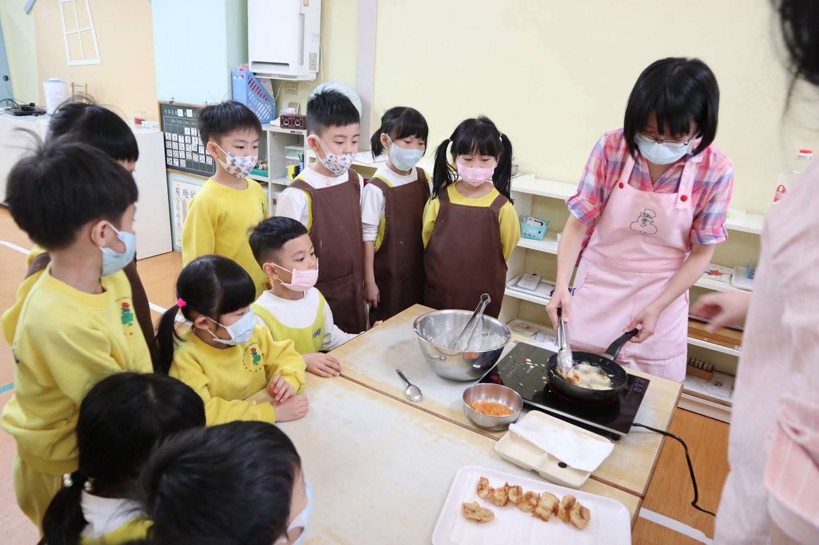最後因應室內社交距離1.5公尺的防疫措施,原本全園的孩子都會聚在一起熱鬧午餐,這一次變成分兩邊教室吃,也很美味且更加安全!在培運老師的帶領下,大班完成了炸香焦與炸蝦餅,中班製作了索多雞湯,小班與幼幼班完成了巴東雞肉,再配上美味薑黃飯及紫米椰奶粥,印尼家常菜,開動囉!