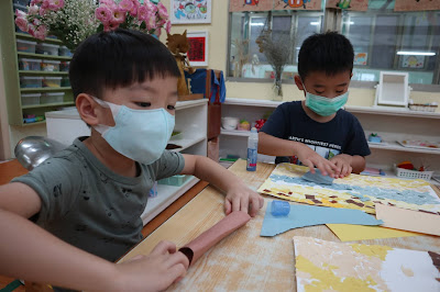 在討論下大家決議了使用撕貼的方式表現沙漠和尼羅河,也因為使用撕貼的方式讓孩子花了好久的時間,但卻有最美的效果~完成了平面後就要加上其他的景物,因為金字塔是立體的所以其它的景物也要立體的!這對孩子而言是一大挑戰,在老師示範幾種立體造型技巧後,孩子們就做出許多可愛的立體造型,甚至是我們沒想到的;孩子們把尼羅河上加了一座橋,還有河畔生長的紙莎草,而大班還將每個人的埃及風景組合成一幅大圖。