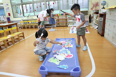 時間不知不覺進入了九月份,夜市玩完了接著要去哪裡呢?找找看自己最喜歡的縣市在哪裡,孩子們都會自己上來表達,也同時練習勇敢,孩子們都很踴躍的發表自己最喜歡的縣市以及原因呢。出發之前要來想想我們需要如何出發唷,孩子們提出了交通工具,大家最喜歡的就是火車了!剛好有許多對火車瞭若指掌的孩子,於是邀請他們蒐集文物並介紹,沒想到台灣的火車這麼多種類,而且孩子們都分得好清楚唷。搭火車之前要買票,還要對號入座唷。老師們將教室座位變成了火車座位的感覺,讓孩子們買完票後自己看著車票尋找座位,也是一種小小挑戰呢!搭著火車我們第一站來到了彰化,觀光工廠與新鮮海產太令人驚喜,於是隔天就迫不及待製作了蚵仔煎分享,還觀察了蛤蜊的模樣;火車開呀開,第二站我們來到了台南,古蹟與小吃無人能敵,一起炸出了白糖粿,特別的口感讓人感到新奇;第三站我們開到了花蓮,美麗的山海風景與傳統的原住民文化,邀請了原住民阿美族的奶奶們和孩子們一同舞蹈,奶奶教會我們傳統的歌曲以及豐年慶的舞蹈,還帶我們製作了手工藝品,真的好有趣唷!謝謝原住民的奶奶們。